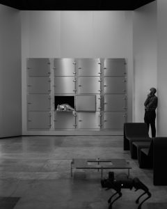 La foto è straniante sia a livello formale che di contenuto. Il cane robotico, il soggetto principale, è tagliato e fuori fuoco, mentre sullo sfondo, a fuoco, altri due soggetti sono lasciati alle loro rispettive solitudini. Dentro uno spazio asettico e freddo, che ricorda più un caveau che una camera mortuaria, nessuno interagisce o comunica con nessuno. Il soffitto nero fa apparire tutto il resto come la scenografia di uno spettacolo teatrale, una messinscena. Il rigore architettonico dell’inquadratura fa venire dei dubbi sull’intenzionalità delle grossolane imprecisioni tecniche. L’idea di mettere assieme robot, vigilanza e morte è molto interessante e originale; tuttavia, il soggetto in primo piano non è sottolineato abbastanza e la resa, pur curata nello sfondo, avrebbe richiesto maggiore attenzione ai dettagli del cane robotico, che emerge solo a un secondo sguardo. Nonostante ciò, il rapporto fra uomo e tecnologia, in questo scatto, non è raccontato o documentato, ma è proposto in forma allusiva e inquietante, come un’ombra nera che spunta da dietro l’armadio.